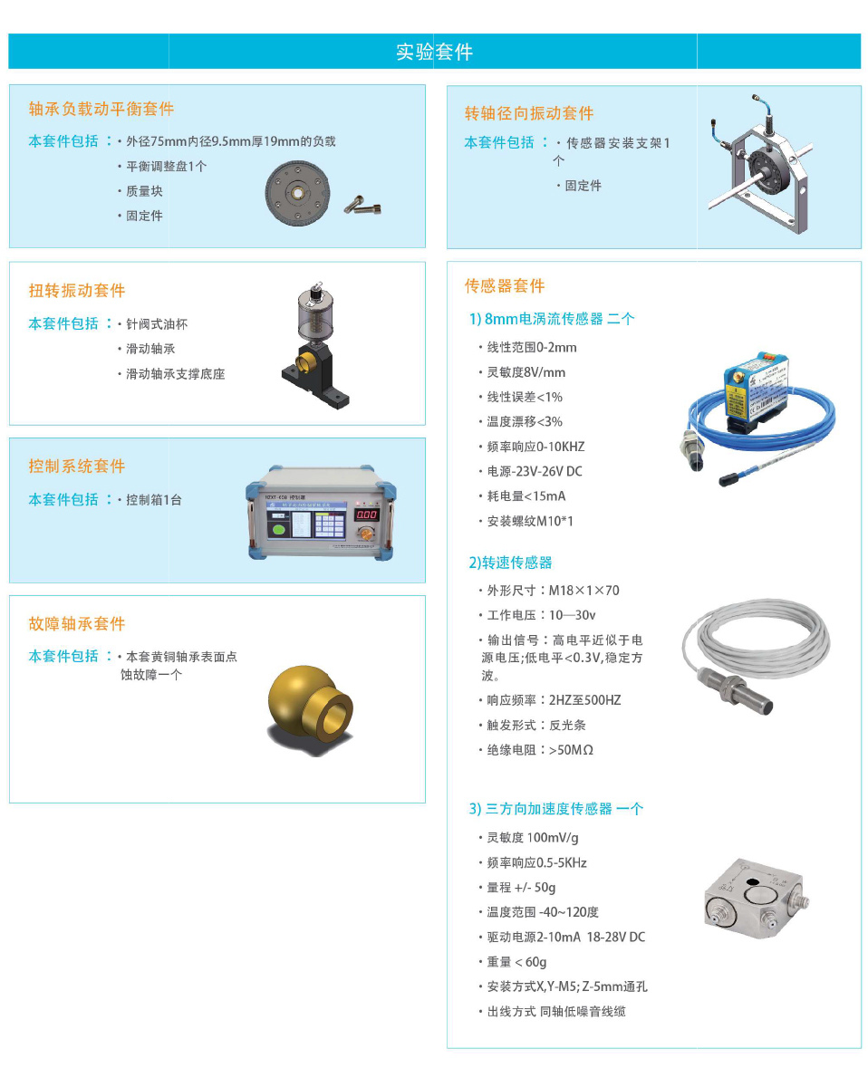 該轉子實驗臺具有結構簡單,拆裝方便,操作簡便,性能穩定的特點。此設備可靈活配置各類傳感器,能對多種常見的旋轉機械故障進行故障特征分析。與本公司開發的數據采集系統配套使用,形成一一個多用途,綜合型的實驗系統平臺,為從事轉子動力學及相關課程探討的研究人員提供了一個良好的實驗分析環境。