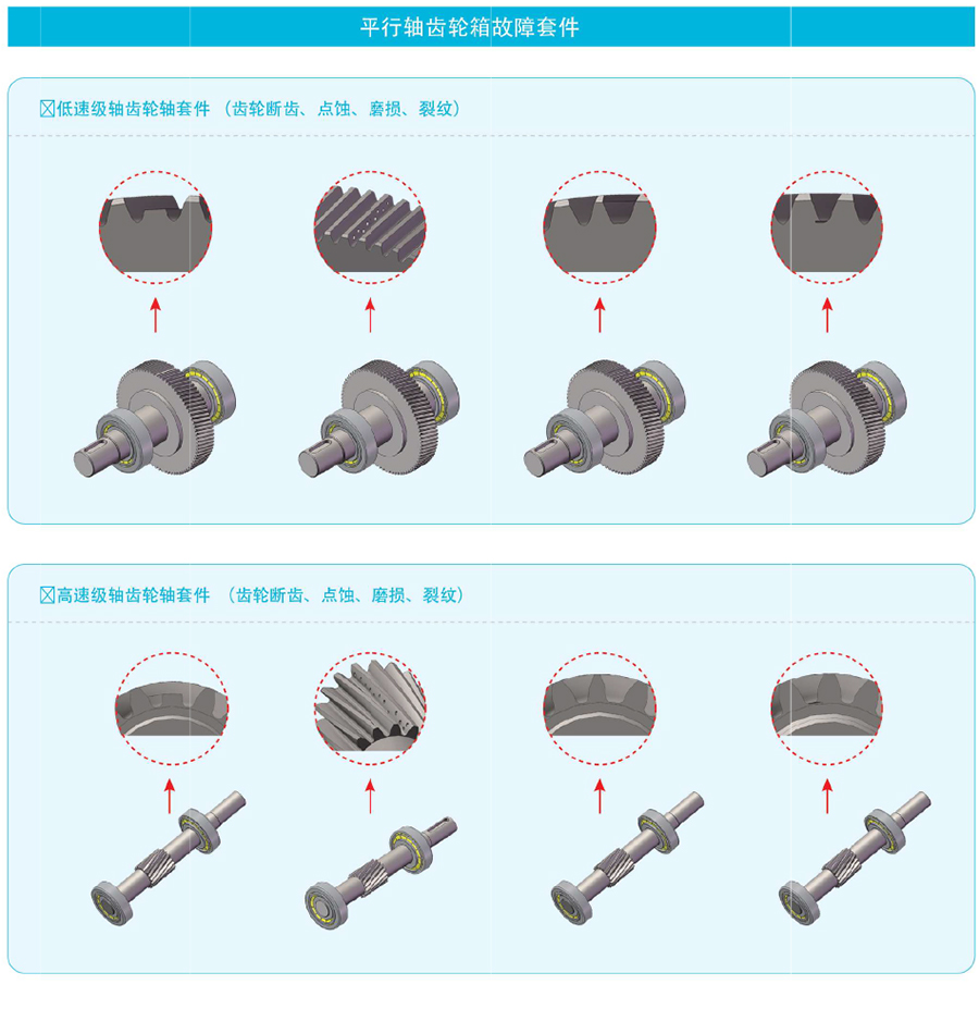 ◆ 平行軸齒輪箱低速軸齒輪故障實驗, 故障類型為:斷齒、點蝕、磨損、裂紋 |