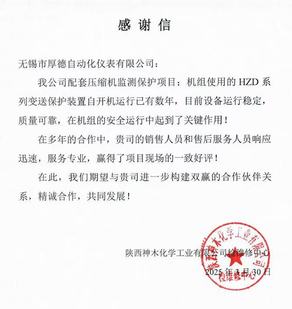 客戶在信中表達了與我司進一步深化合作、構建雙贏伙伴關系的期待。我們深知,客戶的認可是我們前行的動力,客戶的信賴是我們寶貴的財富。未來,我們將繼續以“匠心”打磨產品,以“初心”踐行服務,與更多合作伙伴攜手,為工業安全與智能化發展注入厚德力量!