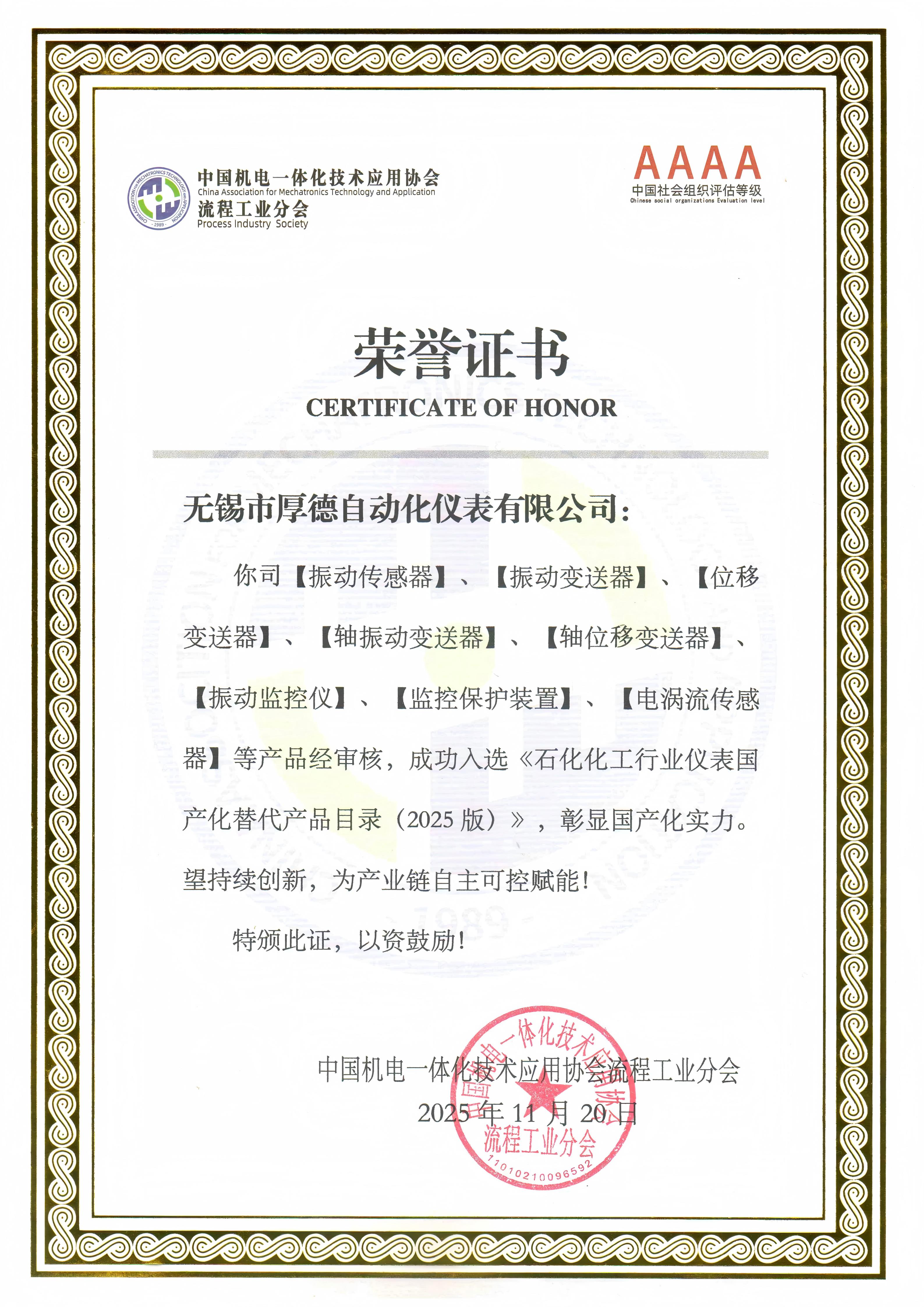 近日,中國機電一體化技術應用協會流程工業分會正式發布《石化化工行業儀表國產化替代產品目錄(2025版)》入選企業名單。無錫市厚德自動化儀表有限公司成功入選該目錄,并榮獲官方認證證書